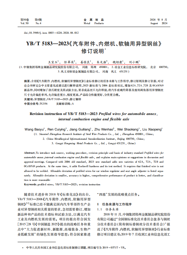 YB/T 5183-2023《汽車附件、內(nèi)燃機、軟軸用異型鋼絲》